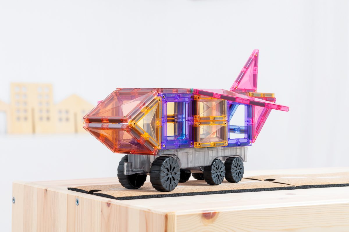 This colourful transport pack takes magnetic play for a spin with a reversible transport base, two motion bases with real rubber wheels and a range of magnetic tile shapes to create different vehicle designs. It’s dynamic, educational and promotes STEM skills like balance and symmetry.