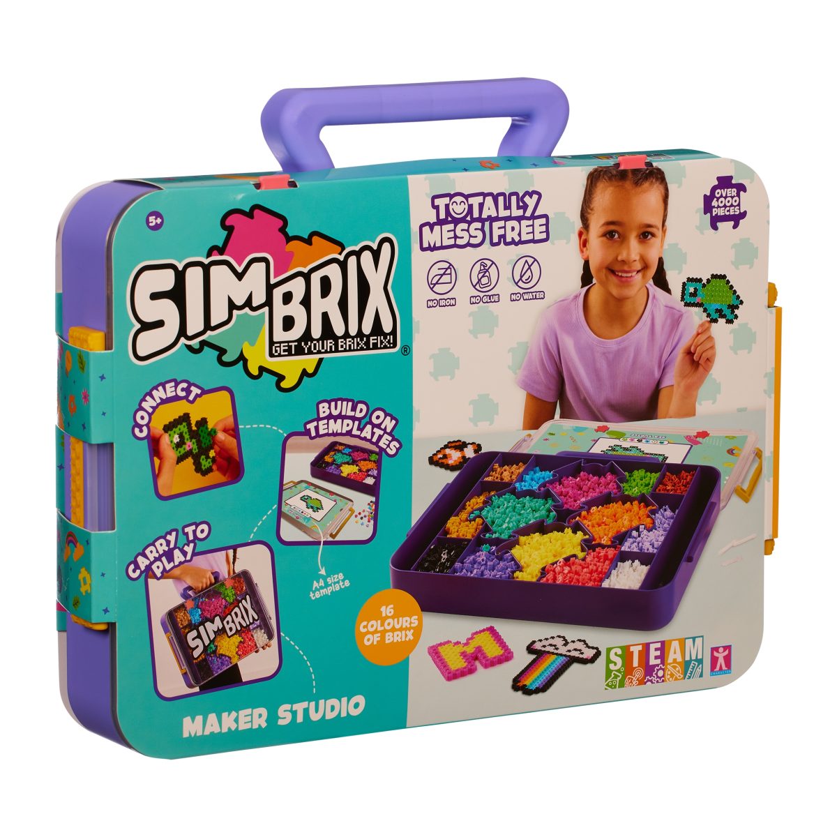 Create pixel perfection with 4000+ colourful Simbrix, neatly packed in a nifty storage box with a buildanywhere lid and easy-carry handle for playtime at home, or out and about. This compact set lets kids snap together vibrant 2D or 3D pixel art – no glue, ironing or water needed.