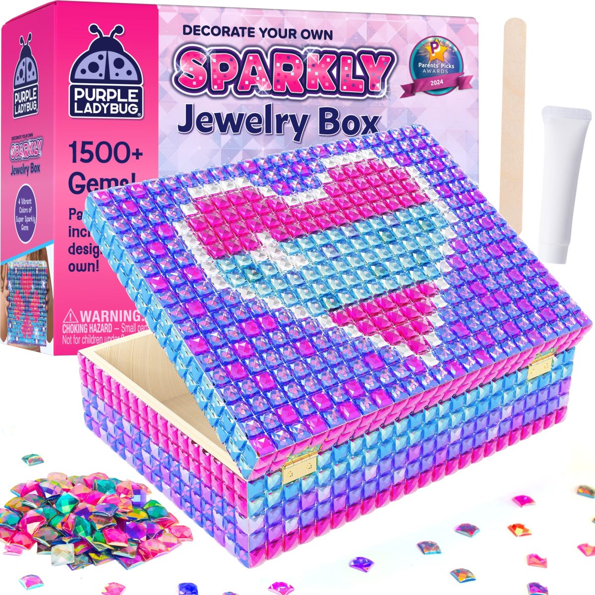 Decorate a premium wooden box using over 1500 dazzling gems in four vibrant colours – pink, purple, blue and silver. With nontoxic glue and easy tools included, kids can design a jewellery box they’ll treasure forever.