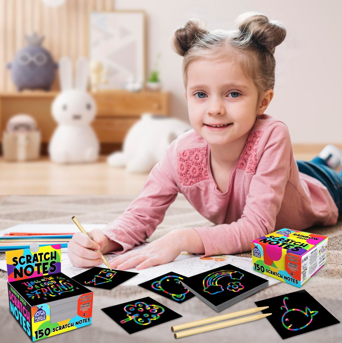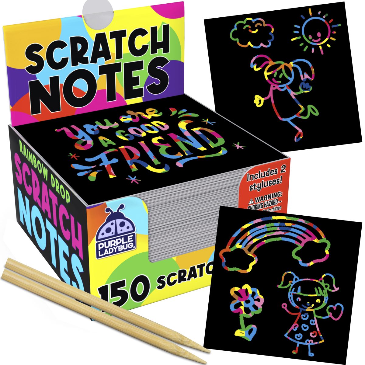 Add a burst of colour to your day with Scratch Mini Notes! Each box includes 150 highquality cards hiding vibrant rainbow layers under matte black. Doodle, write notes or play games, then display in the handy desktop dispenser. Comes with two stylus pens for multiple scratching.